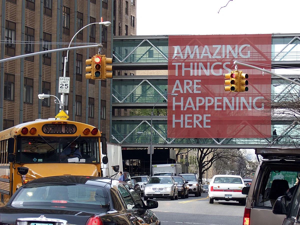 One of the most rewarding stories in this respect involved the massive banner featuring the “AMAZING THINGS ARE HAPPENING HERE” line that we hung from a skyway connecting two of the main NewYork-Presbyterian buildings.